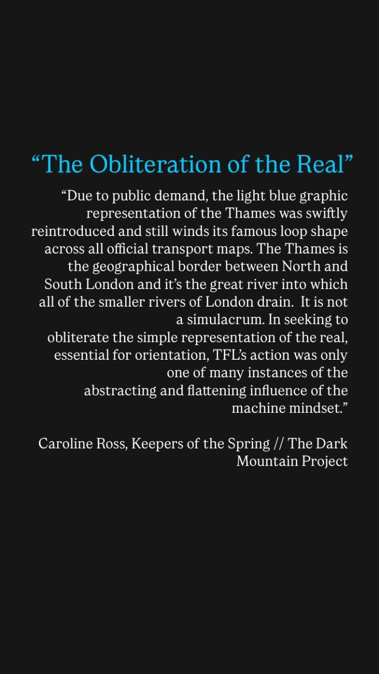 I know a lot about the disorientation and forgetfulness that comes from road maps crowding out waterways as she describes. And how Google maps obliterates our own navigational skills, stealing our ‘song lines’, and the terrifying loss of that relationship with the Real, that ‘flattening effect of the machine mindset’ as carol describes it. With the advent of digital and ai tech its even worse…